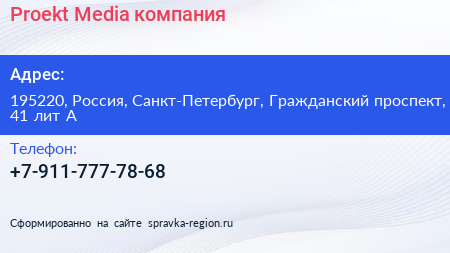 Proekt Media, компания по адресу 195220, Россия, Санкт-Петербург, Гражданский проспект, 41 лит А в дальнейшем Организация, размещена в следующих категориях: