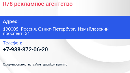 R78, рекламное агентство по адресу 190005, Россия, Санкт-Петербург, Измайловский проспект, 31 в дальнейшем Организация, размещена в следующих категориях: