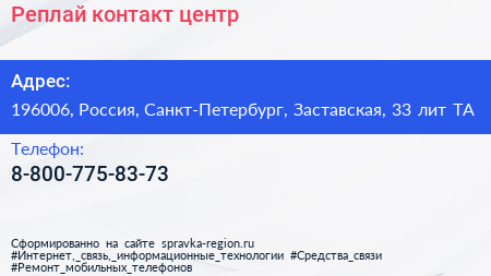 Реплай, контакт-центр по адресу 196006, Россия, Санкт-Петербург, Заставская, 33 лит ТА в дальнейшем Организация, размещена в следующих категориях: