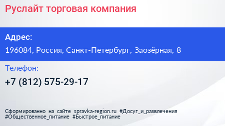 Руслайт, торговая компания по адресу 196084, Россия, Санкт-Петербург, Заозёрная, 8 в дальнейшем Организация, размещена в следующих категориях:
