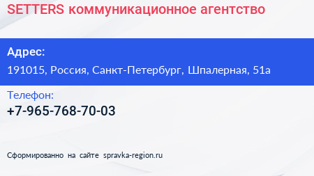 SETTERS, коммуникационное агентство по адресу 191015, Россия, Санкт-Петербург, Шпалерная, 51а в дальнейшем Организация, размещена в следующих категориях: