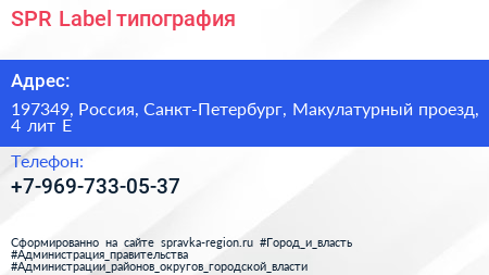 SPR-Label, типография по адресу 197349, Россия, Санкт-Петербург, Макулатурный проезд, 4 лит Е в дальнейшем Организация, размещена в следующих категориях: