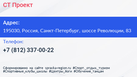 СТ Проект по адресу 195030, Россия, Санкт-Петербург, шоссе Революции, 83 в дальнейшем Организация, размещена в следующих категориях: