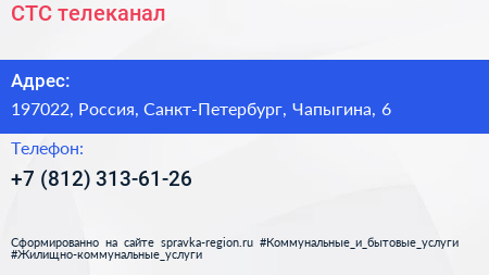 СТС, телеканал по адресу 197022, Россия, Санкт-Петербург, Чапыгина, 6 в дальнейшем Организация, размещена в следующих категориях: