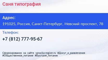 Саня, типография по адресу 191025, Россия, Санкт-Петербург, Невский проспект, 78 в дальнейшем Организация, размещена в следующих категориях: