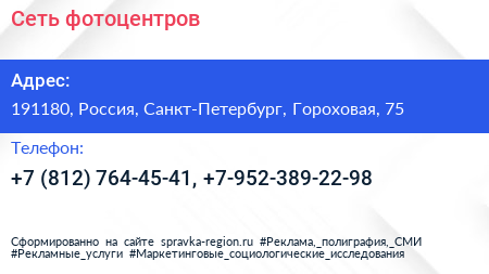 Сеть фотоцентров по адресу 191180, Россия, Санкт-Петербург, Гороховая, 75 в дальнейшем Организация, размещена в следующих категориях: