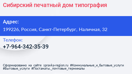 Сибирский печатный дом, типография по адресу 199226, Россия, Санкт-Петербург, Наличная, 32 в дальнейшем Организация, размещена в следующих категориях: