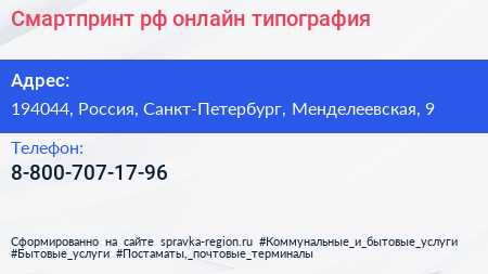 Смартпринт.рф, онлайн-типография по адресу 194044, Россия, Санкт-Петербург, Менделеевская, 9 в дальнейшем Организация, размещена в следующих категориях: