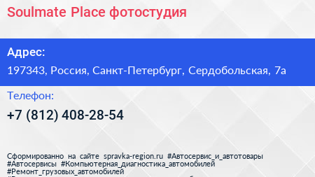 Soulmate Place, фотостудия по адресу 197343, Россия, Санкт-Петербург, Сердобольская, 7а в дальнейшем Организация, размещена в следующих категориях: