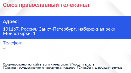 Союз, православный телеканал по адресу 191167, Россия, Санкт-Петербург, набережная реки Монастырки, 1 в дальнейшем Организация, размещена в следующих категориях: