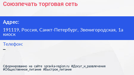 Союзпечать, торговая сеть по адресу 191119, Россия, Санкт-Петербург, Звенигородская, 1а киоск в дальнейшем Организация, размещена в следующих категориях: