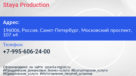Staya Production по адресу 196006, Россия, Санкт-Петербург, Московский проспект, 107 к4 в дальнейшем Организация, размещена в следующих категориях:
