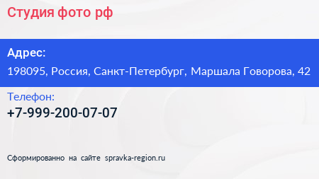 Студия-фото.рф по адресу 198095, Россия, Санкт-Петербург, Маршала Говорова, 42 в дальнейшем Организация, размещена в следующих категориях: