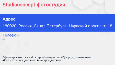 Studioconcept, фотостудия по адресу 190020, Россия, Санкт-Петербург, Нарвский проспект, 18 в дальнейшем Организация, размещена в следующих категориях: