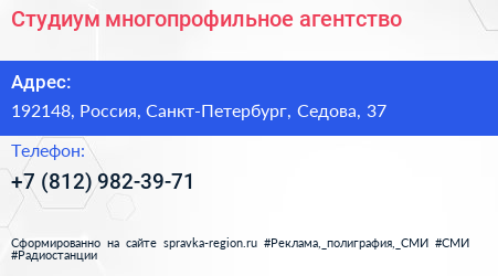 Студиум, многопрофильное агентство по адресу 192148, Россия, Санкт-Петербург, Седова, 37 в дальнейшем Организация, размещена в следующих категориях: