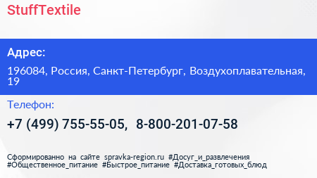 StuffTextile по адресу 196084, Россия, Санкт-Петербург, Воздухоплавательная, 19 в дальнейшем Организация, размещена в следующих категориях: