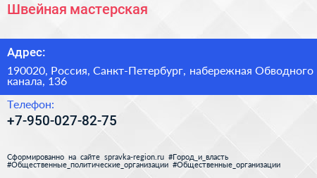 Швейная мастерская по адресу 190020, Россия, Санкт-Петербург, набережная Обводного канала, 136 в дальнейшем Организация, размещена в следующих категориях: