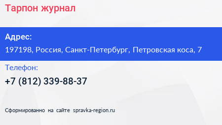 Тарпон, журнал по адресу 197198, Россия, Санкт-Петербург, Петровская коса, 7 в дальнейшем Организация, размещена в следующих категориях: