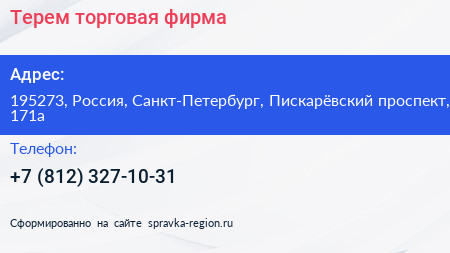 Терем, торговая фирма по адресу 195273, Россия, Санкт-Петербург, Пискарёвский проспект, 171а в дальнейшем Организация, размещена в следующих категориях: