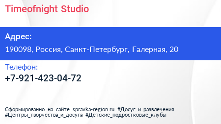 Timeofnight Studio по адресу 190098, Россия, Санкт-Петербург, Галерная, 20 в дальнейшем Организация, размещена в следующих категориях: