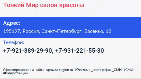 Тонкий Мир, салон красоты по адресу 195197, Россия, Санкт-Петербург, Васенко, 12 в дальнейшем Организация, размещена в следующих категориях: