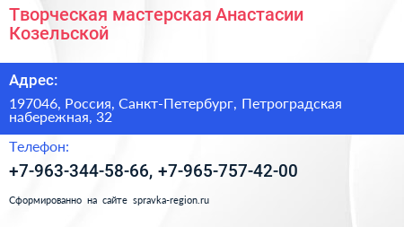 Творческая мастерская Анастасии Козельской по адресу 197046, Россия, Санкт-Петербург, Петроградская набережная, 32 в дальнейшем Организация, размещена в следующих категориях: