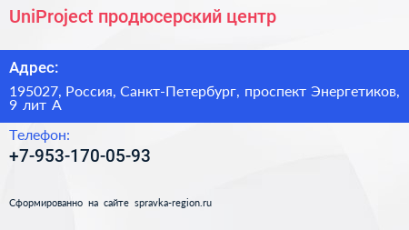 UniProject, продюсерский центр по адресу 195027, Россия, Санкт-Петербург, проспект Энергетиков, 9 лит А в дальнейшем Организация, размещена в следующих категориях: