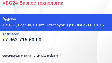 VBG24 Бизнес-технологии по адресу 190031, Россия, Санкт-Петербург, Гражданская, 13-15 в дальнейшем Организация, размещена в следующих категориях: