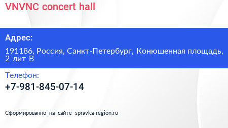VNVNC concert hall по адресу 191186, Россия, Санкт-Петербург, Конюшенная площадь, 2 лит В в дальнейшем Организация, размещена в следующих категориях: