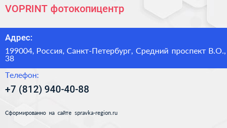 VOPRINT, фотокопицентр по адресу 199004, Россия, Санкт-Петербург, Средний проспект В.О., 38 в дальнейшем Организация, размещена в следующих категориях: