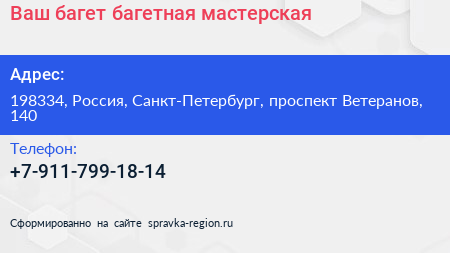 Ваш багет, багетная мастерская по адресу 198334, Россия, Санкт-Петербург, проспект Ветеранов, 140 в дальнейшем Организация, размещена в следующих категориях: