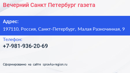 Вечерний Санкт-Петербург, газета по адресу 197110, Россия, Санкт-Петербург, Малая Разночинная, 9 в дальнейшем Организация, размещена в следующих категориях: