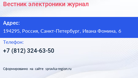Вестник электроники, журнал по адресу 194295, Россия, Санкт-Петербург, Ивана Фомина, 6 в дальнейшем Организация, размещена в следующих категориях:
