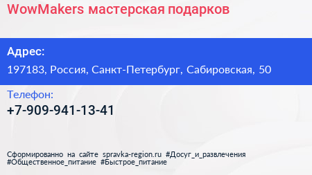 WowMakers, мастерская подарков по адресу 197183, Россия, Санкт-Петербург, Сабировская, 50 в дальнейшем Организация, размещена в следующих категориях: