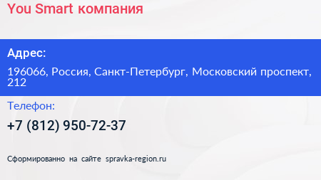 You Smart, компания по адресу 196066, Россия, Санкт-Петербург, Московский проспект, 212 в дальнейшем Организация, размещена в следующих категориях: