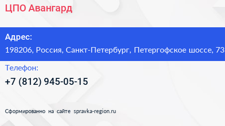 ЦПО Авангард по адресу 198206, Россия, Санкт-Петербург, Петергофское шоссе, 73 в дальнейшем Организация, размещена в следующих категориях: