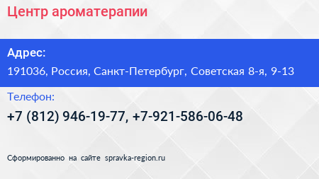 Центр ароматерапии по адресу 191036, Россия, Санкт-Петербург, Советская 8-я, 9-13 в дальнейшем Организация, размещена в следующих категориях: