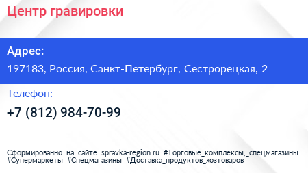 Центр гравировки по адресу 197183, Россия, Санкт-Петербург, Сестрорецкая, 2 в дальнейшем Организация, размещена в следующих категориях: