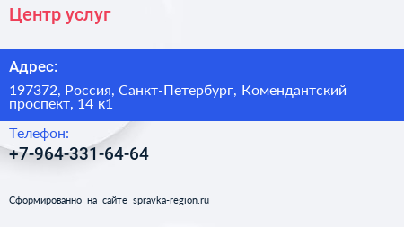 Центр услуг по адресу 197372, Россия, Санкт-Петербург, Комендантский проспект, 14 к1 в дальнейшем Организация, размещена в следующих категориях: