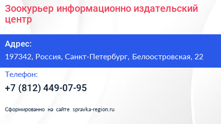 Зоокурьер, информационно-издательский центр по адресу 197342, Россия, Санкт-Петербург, Белоостровская, 22 в дальнейшем Организация, размещена в следующих категориях: