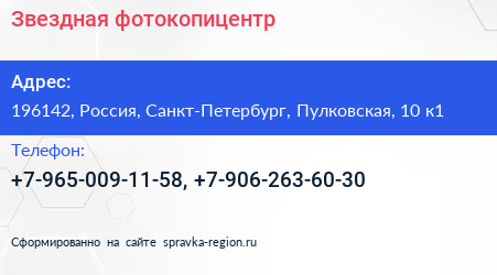 Звездная, фотокопицентр по адресу 196142, Россия, Санкт-Петербург, Пулковская, 10 к1 в дальнейшем Организация, размещена в следующих категориях: