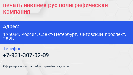 печать-наклеек.рус, полиграфическая компания по адресу 196084, Россия, Санкт-Петербург, Лиговский проспект, 289Б в дальнейшем Организация, размещена в следующих категориях: