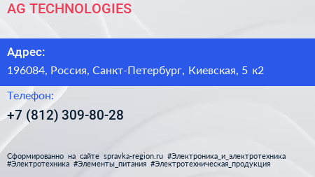 AG-TECHNOLOGIES по адресу 196084, Россия, Санкт-Петербург, Киевская, 5 к2 в дальнейшем Организация, размещена в следующих категориях:
