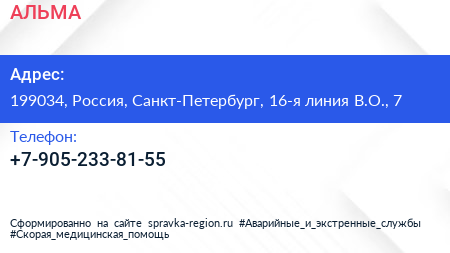 АЛЬМА по адресу 199034, Россия, Санкт-Петербург, 16-я линия В.О., 7 в дальнейшем Организация, размещена в следующих категориях: