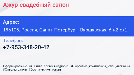 Ажур, свадебный салон по адресу 196105, Россия, Санкт-Петербург, Варшавская, 6 к2 ст1 в дальнейшем Организация, размещена в следующих категориях: