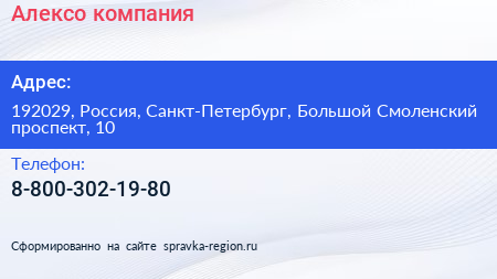 Алексо, компания по адресу 192029, Россия, Санкт-Петербург, Большой Смоленский проспект, 10 в дальнейшем Организация, размещена в следующих категориях: