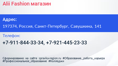 Alii Fashion, магазин по адресу 197374, Россия, Санкт-Петербург, Савушкина, 141 в дальнейшем Организация, размещена в следующих категориях: