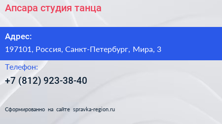 Апсара, студия танца по адресу 197101, Россия, Санкт-Петербург, Мира, 3 в дальнейшем Организация, размещена в следующих категориях: