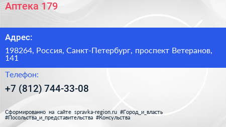 Аптека №179 по адресу 198264, Россия, Санкт-Петербург, проспект Ветеранов, 141 в дальнейшем Организация, размещена в следующих категориях: