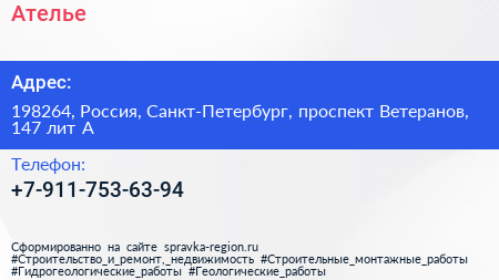 Ателье по адресу 198264, Россия, Санкт-Петербург, проспект Ветеранов, 147 лит А в дальнейшем Организация, размещена в следующих категориях: